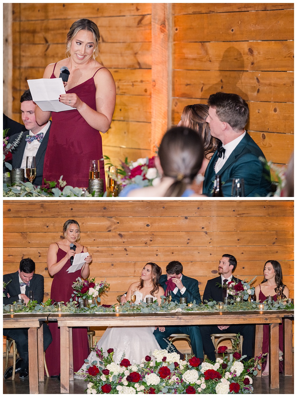 As the celebration unfolded, the barn glowed with rich burgundy and green details that subtly nodded to the Christmas season without overpowering the timeless design. I especially loved how the white draping brightened up the barn reception space.
