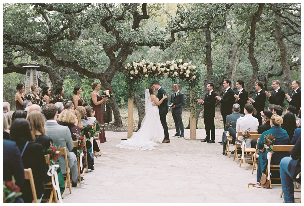 December weddings come with two predictable challenges: shorter days and unpredictable cloud cover. On Natalie and Tate’s wedding day, the light was fully diffused from morning through sunset. While soft light is beautiful for portraits, the darker skies meant we lost usable natural light earlier than the clock suggested. Their ceremony began at 4:00 PM with a 5:30 PM sunset. If the timeline had pushed any later, there would have been little to no natural light remaining for portraits after the ceremony. By building the day around a first look, we completed the majority of portraits beforehand. That single decision ensured their gallery would still feel bright, clean, and true to the season. For winter weddings, this approach with including a first look is less about preference and more about protection. All of the following ceremony photos were taken on film.